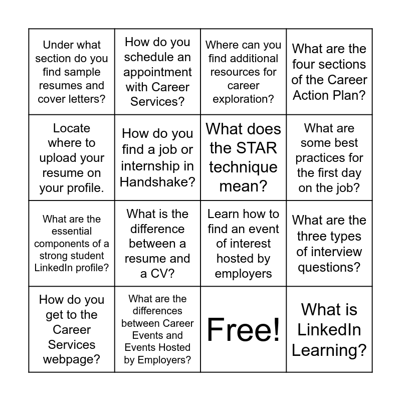 This bingo card has 17 words: Free!, How do you get to the Career Services webpage?, Where can you find additional resources for career exploration?, Under what section do you find sample resumes and cover letters?, What is the difference between a resume and a CV?, What are the four sections of the Career Action Plan?, What are the three types of interview questions?, What does the STAR technique mean?, What are some best practices for the first day on the job?, How do you find a job or internship in Handshake?, What are the differences between Career Events and Events Hosted by Employers?, Learn how to find an event of interest hosted by employers, Locate where to upload your resume on your profile., How do you schedule an appointment with Career Services?, What are the essential components of a strong student LinkedIn profile?, What can you do on the St. John Fisher University page that you cannot do with the St. John Fisher Alumni Group? and What is LinkedIn Learning?.