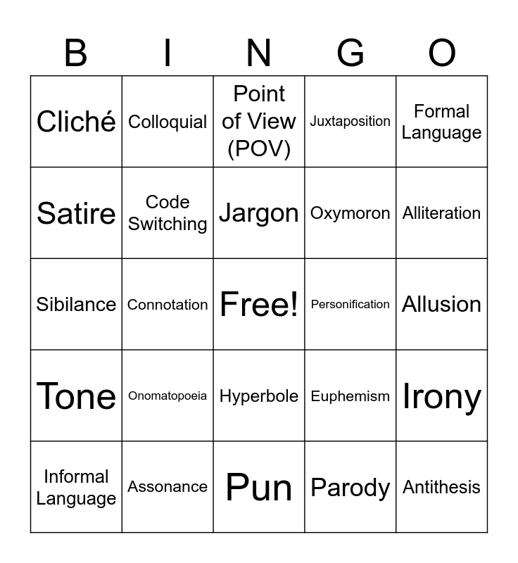 This bingo card has a free space and 33 words: Repetition, Emotive Language, Connotation, Change in Tense, Tone, Code Switching, Formal Language, Informal Language, Colloquial, Slang, Jargon, Point of View (POV), Simile, Metaphor, Personification, Alliteration, Assonance, Sibilance, Onomatopoeia, Euphemism, Hyperbole, Litotes, Cliché, Allusion, Pun, Antithesis, Juxtaposition, Oxymoron, Satire, Irony, Sarcasm, Parody and Imagery.