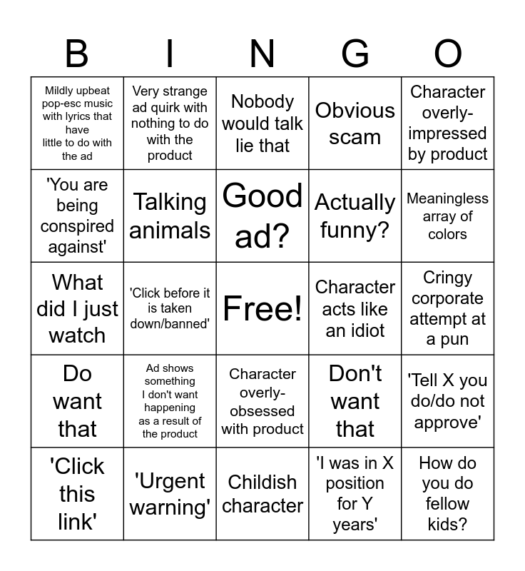 This bingo card has a free space and 30 words: 'Urgent warning', 'They do not want you to see this', 'Click before it is taken down/banned', Told me nothing about the product, Mildly upbeat pop-esc music with lyrics that have little to do with the ad, Nobody would talk lie that, Talking animals, Character overly-obsessed with product, Character acts like an idiot, Childish character, Cringy corporate attempt at a pun, How do you do fellow kids?, 'I was in X position for Y years', 'I cannot believe I never used X', Meaningless array of colors, Wrong audience, buddy! (Would never have use for it), Don't want that, Do want that, Ad shows something I don't want happening as a result of the product, Character overly-impressed by product, What did I just watch, Close up camera angle shoot of the product with a bland background, Very strange ad quirk with nothing to do with the product, Actually funny?, 'You are being conspired against', Obvious scam, 'Tell X you do/do not approve', 'Click this link', Good ad? and Sob story.