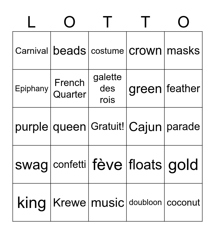 This bingo card has a free space and 26 words: fève, doubloon, galette des rois, Krewe, masks, Carnival, Epiphany, beads, parade, floats, green, purple, gold, king, queen, Ash Wednesday, crown, swag, costume, coconut, feather, music, Cajun, confetti, French Quarter and party.
