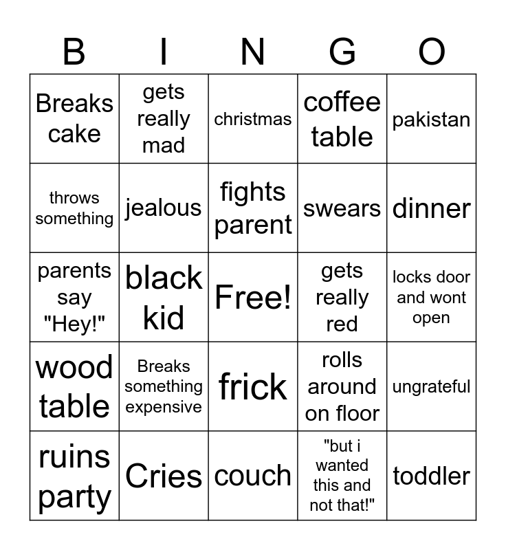 This bingo card has a free space and 24 words: Breaks something expensive, Cries, fights parent, ruins party, pakistan, Breaks cake, throws something, gets really mad, gets really red, frick, swears, parents say "Hey!", rolls around on floor, ungrateful, jealous, "but i wanted this and not that!", locks door and wont open, christmas, dinner, black kid, toddler, wood table, coffee table and couch.