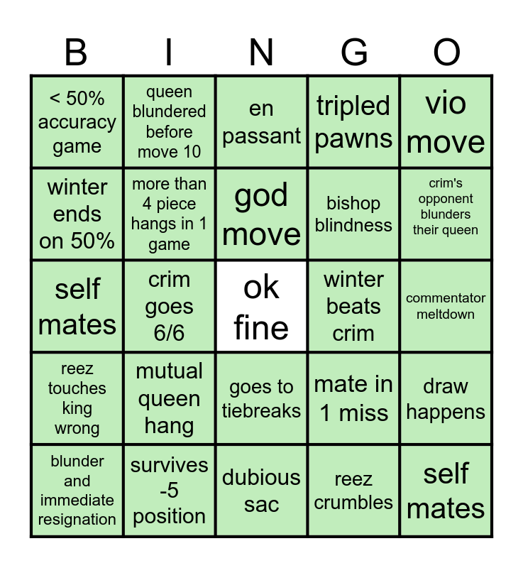 This bingo card has a free space and 24 words: mutual queen hang, survives -5 position, god move, blunder and immediate resignation, vio move, < 50% accuracy game, winter ends on 50%, queen blundered before move 10, winter beats crim, goes to tiebreaks, bishop blindness, self mates, mate in 1 miss, draw happens, more than 4 piece hangs in 1 game, reez crumbles, commentator meltdown, en passant, crim's opponent blunders their queen, crim goes 6/6, self mates, reez touches king wrong, tripled pawns and dubious sac.