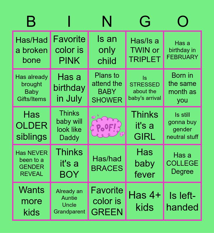 This bingo card has a free space and 29 words: Wants more kids, Thinks baby will look like Mommy, Thinks baby will look like Daddy, Changed their guess since arriving, Has/Had a broken bone, Is an only child, Has a birthday in July, Thinks it's a BOY, Thinks it's a GIRL, Already an Auntie Uncle Grandparent, Is still gonna buy gender neutral stuff, Is left-handed, Favorite color is GREEN, Has 4+ kids, Born in the same month as you, Traveled 50+ miles to attend, Has/had BRACES, Has NEVER been to a GENDER REVEAL, Has a birthday in FEBRUARY, Has OLDER siblings, Has baby fever, Is on a "DIET", Is STRESSED about the baby's arrival, Has already brought Baby Gifts/Items, Has/Is a TWIN or TRIPLET, Favorite color is PINK, Has a COLLEGE Degree, Plans to attend the BABY SHOWER and DOESN'T want KIDS.