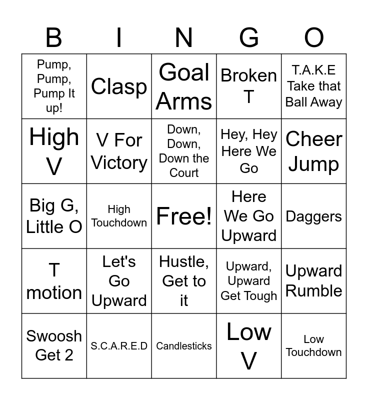 This bingo card has a free space and 24 words: Let's Go Upward, S.C.A.R.E.D, Down, Down, Down the Court, Swoosh Get 2, T.A.K.E Take that Ball Away, Pump, Pump, Pump It up!, High V, Clasp, Here We Go Upward, Hustle, Get to it, Hey, Hey Here We Go, Big G, Little O, Upward, Upward Get Tough, Upward Rumble, V For Victory, Low V, Daggers, Goal Arms, Cheer Jump, High Touchdown, Low Touchdown, T motion, Broken T and Candlesticks.