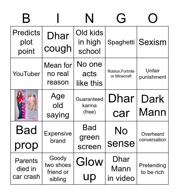 This bingo card has 1 images, a free space and 30 words: Glow up, Trying to get on team, Age old saying, Cringe/corny, Predicts plot point, Old kids in high school, Mean for no real reason, No sense, Dhar car, Dhar Mann in video, Dark Mann, Pretending to be rich, Rich parents mean to kid, Extreme coincidence, Unfair punishment, Problematic lesson, Overheard conversation, Expensive brand, Bad prop, Bad green screen, Sexism, Racism, Parents died in car crash, Dhar cough, Roblox,Fortnite or Minecraft, YouTuber, Spaghetti, Goody two shoes friend or sibling, No one acts like this and Technology dosent work that way.