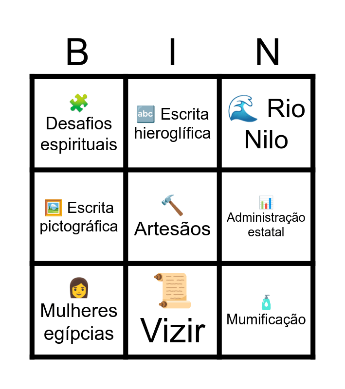 This bingo card has 75 words: 🏜️ Egito Antigo, 👑 Faraó, 🌊 Rio Nilo, 🌧️ Cheias do Nilo, 🌱 Sedimentos férteis, 🚜 Agricultura de inundação, 🔴⚪ Unificação do Egito, ⬆️ Alto Egito, ⬇️ Baixo Egito, 🏛️ Monarquia teocrática, 👨👩👦 Dinastia, 🏺 Império Egípcio, 📜 Vizir, 📊 Administração estatal, ✍️ Escribas, 🌆 Capital egípcia, 🪜 Sociedade hierarquizada, 💎 Nobreza egípcia, 🌾 Camponeses, 🔨 Artesãos, ⛓️ Escravidão, 🛡️ Polícia do Novo Império, 👩 Mulheres egípcias, 🔤 Escrita hieroglífica, 🖼️ Escrita pictográfica, 🪨 Hieróglifos, 📖 Escrita hierática, 📄 Escrita demótica, 📜 Papiro, ✨ Medu Netjer, ☥ Ankh, 👁️ Olho de Hórus, 🔮 Força vital, ♾️ Símbolo de eternidade, 🛐 Proteção divina, 🧴 Mumificação, ⚰️ Ritos funerários, 🌌 Vida após a morte, 🏺 Tumbas egípcias, 🔺 Pirâmides, 🪦 Sarcófago, 📚 Livro dos Mortos, ⚖️ Confissão Negativa, 👨⚖️ Julgamento dos mortos, ⚖️ Balança da verdade, 🌾 Aaru, ❤️ Coração como consciência, 🧩 Desafios espirituais, 🧍 Ushabtis, 🎁 Objetos funerários, 🐈 Animais sagrados, 🏛️ Templos egípcios, 🎨 Arte egípcia religiosa, 🔱 Arte simbólica, 📏 Bidimensionalidade artística, 👤 Representação lateral, ⚖️ Simetria, 🎨 Uso simbólico das cores, 🗿 Estátuas funerárias, 👄 Ritual de abertura da boca, 🌟 Ka, 🛐 Espiritualidade egípcia, ⚖️ Maat, 👑 Justiça divina, 🏛️ Salão das Duas Verdades, 📜 Manual funerário, ♾️ Crença na eternidade, 🏗️ Monumentos religiosos, 👥 Religião politeísta, 🕯️ Culto aos mortos, 🧙 Hierarquia religiosa, 🔔 Cerimônias sagradas, 🙏 Comunicação com os deuses, 💧 Civilização hidráulica and 🌍 Vale do Nilo.