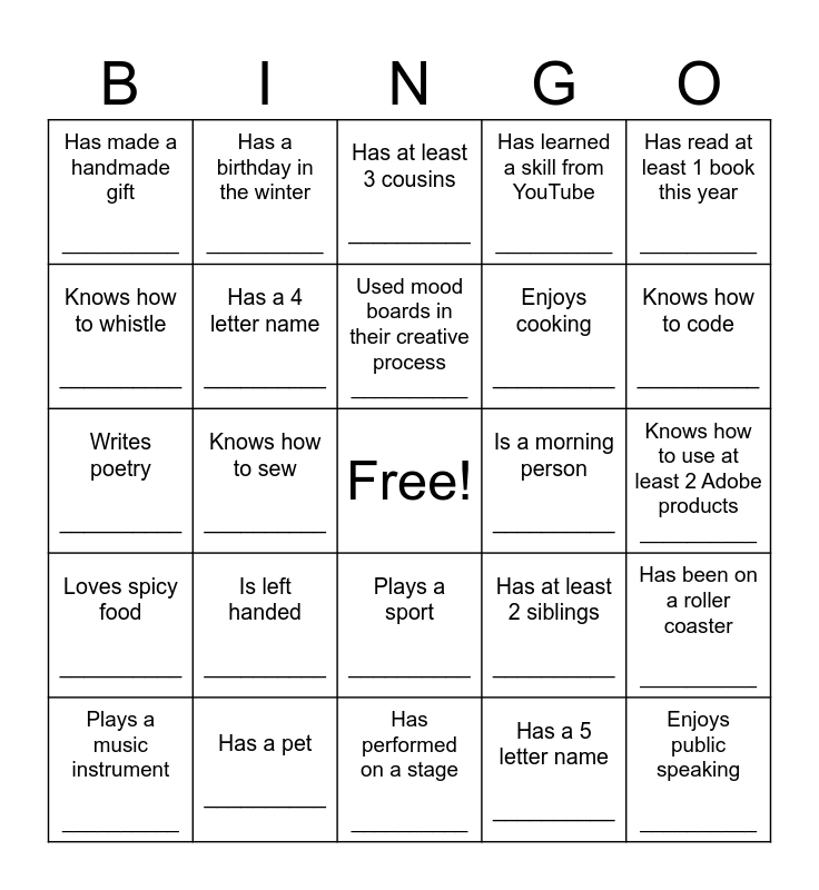 This bingo card has a free space and 24 words: Is left handed __________, Has a pet __________, Used mood boards in their creative process __________, Plays a music instrument __________, Has read at least 1 book this year __________, Has made a handmade gift __________, Knows how to whistle __________, Has a birthday in the winter __________, Is a morning person __________, Plays a sport __________, Enjoys cooking __________, Writes poetry __________, Has at least 2 siblings __________, Has been on a roller coaster __________, Has a 4 letter name __________, Has a 5 letter name __________, Knows how to use at least 2 Adobe products __________, Has at least 3 cousins __________, Knows how to code __________, Knows how to sew __________, Enjoys public speaking __________, Loves spicy food __________, Has learned a skill from YouTube __________ and Has performed on a stage __________.