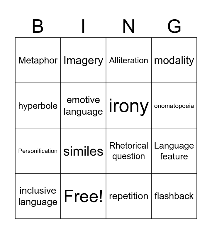 This bingo card has 16 words: Free!, Language feature, Alliteration, Metaphor, Personification, Imagery, Rhetorical question, repetition, hyperbole, emotive language, inclusive language, modality, similes, onomatopoeia, irony and flashback.