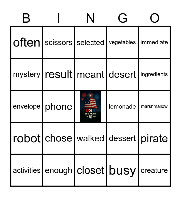 This bingo card has a free space and 26 words: walked, busy, meant, enough, immediate, often, mystery, scissors, marshmallow, dessert, desert, envelope, pirate, activities, phone, necklace, vegetables, robot, selected, creature, ingredients, closet, lemonade, chose, result and picnic.