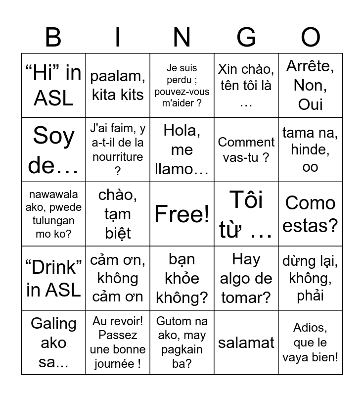 This bingo card has a free space and 44 words: Para, no, si, Adios, que le vaya bien!, Kamusta! Ako ay si, Galing ako sa..., Kamusta ka na, salamat, Je suis perdu ; pouvez-vous m'aider ?, Prendre à droite, prendre à gauche, aller tout droit, Arrête, Non, Oui, Au revoir! Passez une bonne journée !, Xin chào, tên tôi là …, Tôi từ …, bạn khỏe không?, cảm ơn, không cảm ơn, “Help” in ASL, Gutom na ako, may pagkain ba?, mayroon bang inumin?, nawawala ako, pwede tulungan mo ko?, kumanan, kumaliwa, dumiretso, tama na, hinde, oo, paalam, kita kits, Có gì uống không?, Tôi bị lạc, bạn có thể giúp không?, “Hi” in ASL, “Thank you” in ASL, Como estas?, Gracias/No gracias, Tengo hambre, hay algo que comer?, Hay algo de tomar?, “Drink” in ASL, Đi phải, đi trái, đi thẳng, dừng lại, không, phải, Tôi đói, có gì ăn không?, Ve a la derecha, izquierda, derecho, chào, tạm biệt, Salut ! Je m'appelle........, Je viens de......., Y a-t-il quelque chose à boire ?, Hola, me llamo…, Soy de…, Comment vas-tu ?, Merci / non merci, J'ai faim, y a-t-il de la nourriture ? and Estoy perdido, me puede ayudar?.