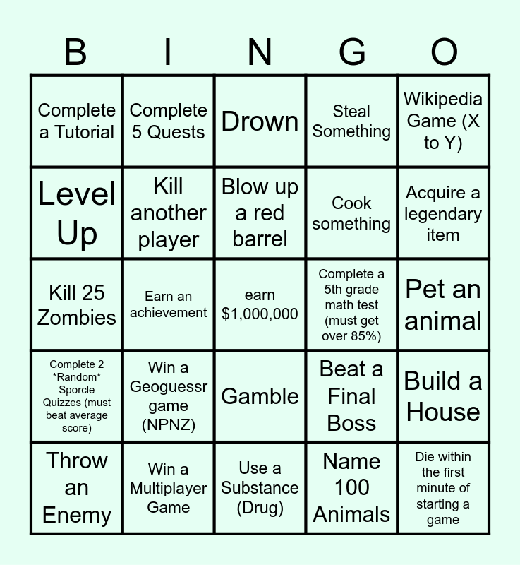 This bingo card has 25 words: Win a Geoguessr game (NPNZ), Use a Substance (Drug), Blow up a red barrel, Throw an Enemy, Wikipedia Game (X to Y), Complete a Tutorial, Level Up, Complete 5 Quests, Complete a 5th grade math test (must get over 85%), Gamble, Cook something, Kill 25 Zombies, Beat a Final Boss, Build a House, Kill another player, Die within the first minute of starting a game, Pet an animal, Drown, Acquire a legendary item, Earn an achievement, earn $1,000,000, Win a Multiplayer Game, Complete 2 *Random* Sporcle Quizzes (must beat average score), Steal Something and Name 100 Animals.