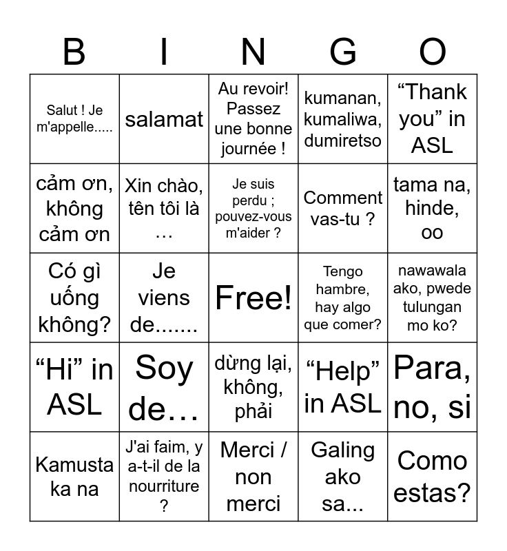 This bingo card has a free space and 44 words: Estoy perdido, me puede ayudar?, Como estas?, Hay algo de tomar?, Kamusta ka na, bạn khỏe không?, Galing ako sa..., Au revoir! Passez une bonne journée !, Adios, que le vaya bien!, “Thank you” in ASL, J'ai faim, y a-t-il de la nourriture ?, kumanan, kumaliwa, dumiretso, Tengo hambre, hay algo que comer?, dừng lại, không, phải, Soy de…, Hola, me llamo…, Merci / non merci, Gutom na ako, may pagkain ba?, Có gì uống không?, Đi phải, đi trái, đi thẳng, tama na, hinde, oo, salamat, Tôi bị lạc, bạn có thể giúp không?, Y a-t-il quelque chose à boire ?, Salut ! Je m'appelle....., Tôi đói, có gì ăn không?, nawawala ako, pwede tulungan mo ko?, “Drink” in ASL, chào, tạm biệt, “Help” in ASL, “Hi” in ASL, Ve a la derecha, izquierda, derecho, Para, no, si, mayroon bang inumin?, Arrête, Non, Oui, Je viens de......., Kamusta! Ako ay si, Gracias/No gracias, Prendre à droite, prendre à gauche, aller tout droit, Je suis perdu ; pouvez-vous m'aider ?, cảm ơn, không cảm ơn, Comment vas-tu ?, paalam, kita kits, Xin chào, tên tôi là … and Tôi từ ….