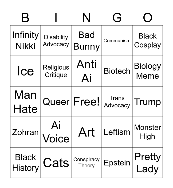 This bingo card has a free space and 24 words: Ai Voice, Cats, Anti Ai, Black History, Black Cosplay, Infinity Nikki, Ice, Disability Advocacy, Trans Advocacy, Art, Biotech, Man Hate, Leftism, Monster High, Religious Critique, Epstein, Trump, Bad Bunny, Biology Meme, Queer, Pretty Lady, Zohran, Communism and Conspiracy Theory.