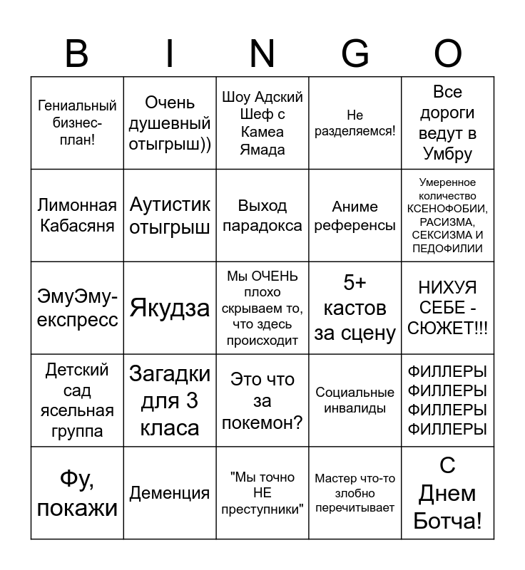 This bingo card has a free space and 24 words: Загадки для 3 класа, Деменция, Выход парадокса, Фу, покажи, Все дороги ведут в Умбру, Гениальный бизнес-план!, Лимонная Кабасяня, Очень душевный отыгрыш)), 5+ кастов за сцену, Это что за покемон?, Аниме референсы, ЭмуЭму- експресс, Социальные инвалиды, ФИЛЛЕРЫ ФИЛЛЕРЫ ФИЛЛЕРЫ ФИЛЛЕРЫ, Аутистик отыгрыш, Мастер что-то злобно перечитывает, НИХУЯ СЕБЕ - СЮЖЕТ!!!, Шоу Адский Шеф с Камеа Ямада, Умеренное количество КСЕНОФОБИИ, РАСИЗМА, СЕКСИЗМА И ПЕДОФИЛИИ, Якудза, С Днем Ботча!, Детский сад ясельная группа, Не разделяемся! and "Мы точно НЕ преступники".
