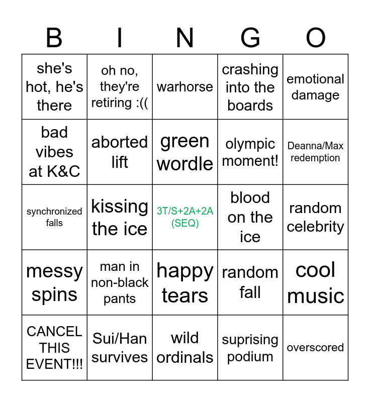 This bingo card has a free space and 30 words: Sui/Han survives, rink DJ vibing, kissing the ice, scary lift, she's hot, he's there, warhorse, aborted lift, happy tears, blood on the ice, wild ordinals, random celebrity, overscored, suprising podium, supportive audience, Deanna/Max redemption, RikuRyu redemption, random fall, messy spins, man in non-black pants, emotional damage, synchronized falls, skaters in the audience, oh no, they're retiring :((, olympic moment!, bad vibes at K&C, crashing into the boards, cool music, CANCEL THIS EVENT!!!, green wordle and P/M top5.