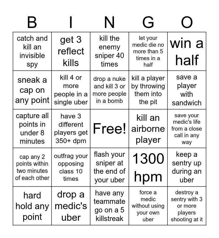 This bingo card has a free space and 24 words: outfrag your opposing class 10 times, drop a medic's uber, drop a nuke and kill 3 or more people in a bomb, hard hold any point, win a half, catch and kill an invisible spy, sneak a cap on any point, get 3 reflect kills, kill an airborne player, flash your sniper at the end of your uber, kill a player by throwing them into the pit, capture all points in under 8 minutes, 1300 hpm, keep a sentry up during an uber, kill 4 or more people in a single uber, force a medic without using your own uber, save your medic's life from a close call in any way, kill the enemy sniper 40 times, save a player with sandwich, have 3 different players get 350+ dpm, destroy a sentry with 3 or more players shooting at it, cap any 2 points within two minutes of each other, let your medic die no more than 5 times in a half and have any teammate go on a 5 killstreak.
