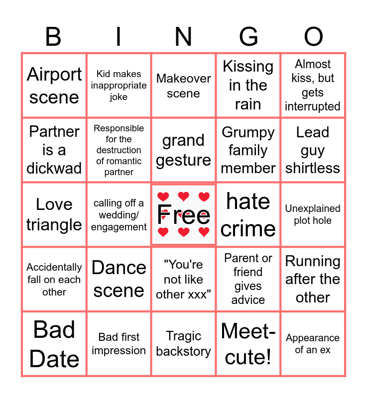 This bingo card has a free space and 44 words: Montage, Appearance of an ex, quirky or gay BFF, Bad Date, It's a bet, Meet-cute!, Makeover scene, Physical Comedy, Almost kiss, but gets interrupted, Bad first impression, Kissing in the rain, hate crime, "You're not like other xxx", Dance scene, Poor timing, Tragic backstory, Enemies to lovers, Love triangle, Miss-communication or misunderstanding that causes drama/fight, Lead guy shirtless, Kid makes inappropriate joke, breakup wine or ice cream session in PJ's, Lead being clumsy, Airport scene, Singing in public to profess love, Unexplained plot hole, One of the leads is rich, Love at first sight (in awe stare), Parent or friend gives advice, Accidentally fall on each other, Secondary characters get together, Running after the other, Slow motion kiss!, A lie is revealed, calling off a wedding/ engagement, cute accent, iconic landmark, Trouble saying I Love You, grand gesture, Partner is a dickwad, Grumpy family member, Prior history with a character, Responsible for the destruction of romantic partner and Cheesy musical scene.