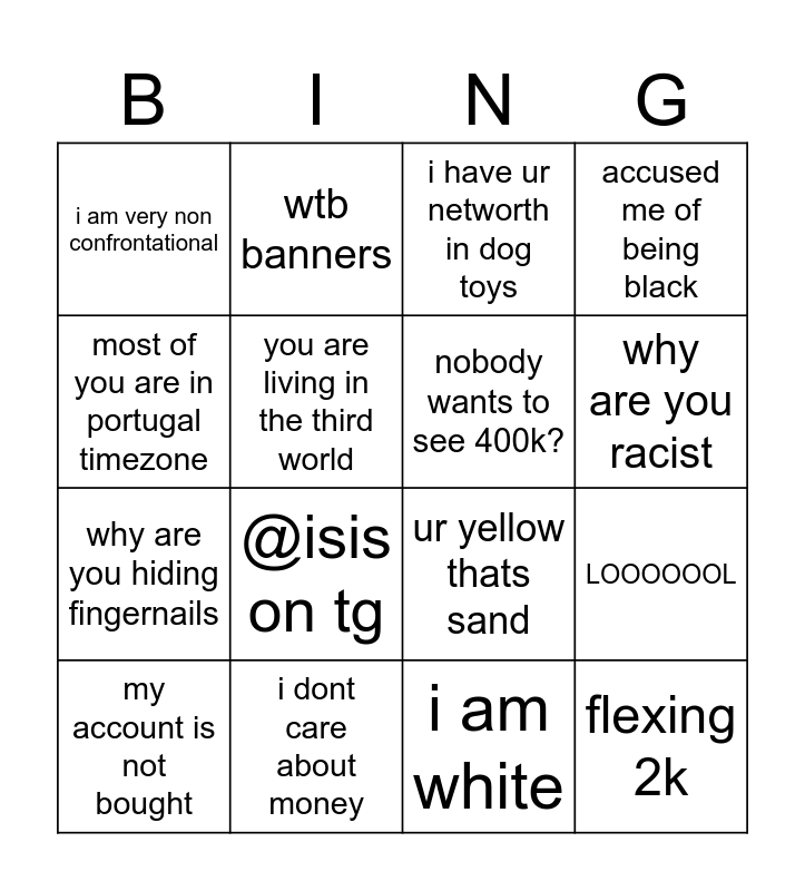 This bingo card has 16 words: i dont care about money, LOOOOOOL, i have ur networth in dog toys, i am very non confrontational, why are you hiding fingernails, wtb banners, ur yellow thats sand, i am white, most of you are in portugal timezone, you are living in the third world, my account is not bought, accused me of being black, @isis on tg, why are you racist, nobody wants to see 400k? and flexing 2k.