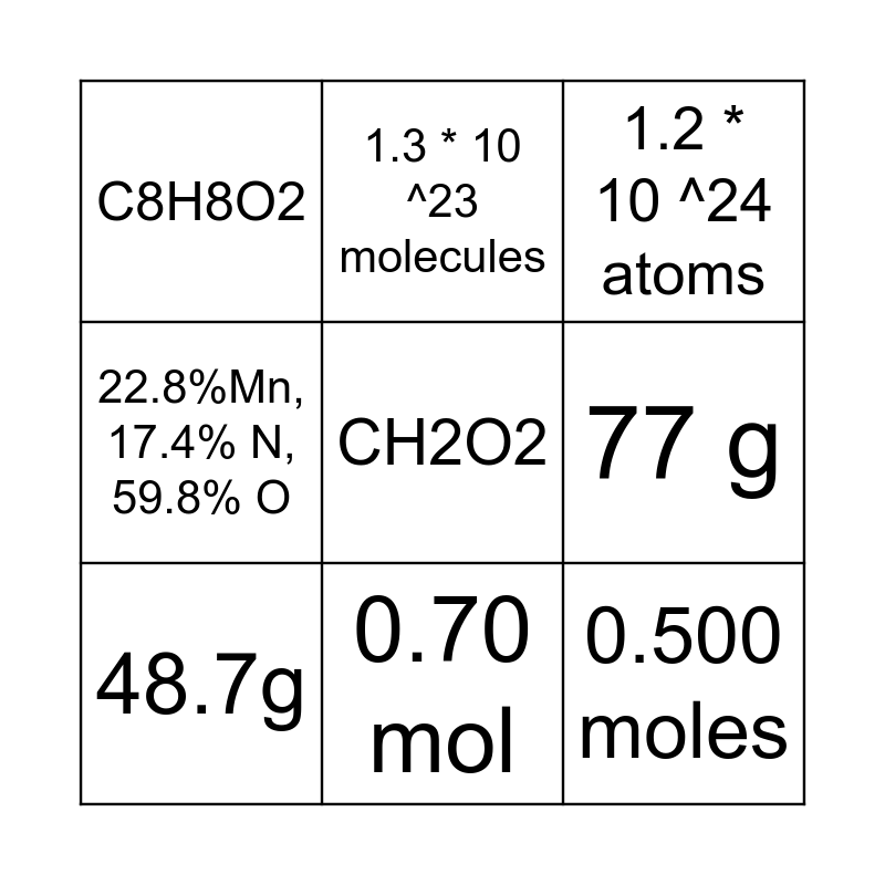 This bingo card has 11 words: 0.500 moles, 0.70 mol, CH2O2, 48.7g, 1.3 * 10 ^23 molecules, 1.2 * 10 ^24 atoms, 77 g, 190 g, 22.8%Mn, 17.4% N, 59.8% O, C8H8O2 and C6H12O12.