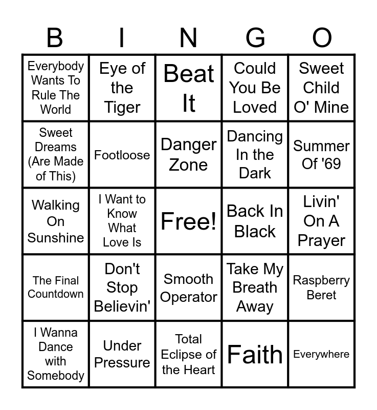 This bingo card has a free space and 24 words: Don't Stop Believin', Under Pressure, Danger Zone, I Wanna Dance with Somebody, Sweet Child O' Mine, Everybody Wants To Rule The World, Sweet Dreams (Are Made of This), Eye of the Tiger, Back In Black, Smooth Operator, Dancing In the Dark, Walking On Sunshine, Take My Breath Away, Raspberry Beret, Footloose, Faith, Livin' On A Prayer, Beat It, Summer Of '69, I Want to Know What Love Is, Everywhere, The Final Countdown, Could You Be Loved and Total Eclipse of the Heart.