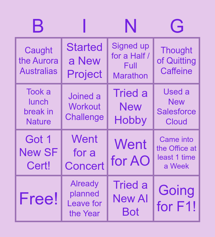 This bingo card has 16 words: Already planned Leave for the Year, Came into the Office at least 1 time a Week, Signed up for a Half / Full Marathon, Caught the Aurora Australias, Got 1 New SF Cert!, Started a New Project, Went for AO, Tried a New AI Bot, Took a lunch break in Nature, Joined a Workout Challenge, Free!, Thought of Quitting Caffeine, Went for a Concert, Used a New Salesforce Cloud, Tried a New Hobby and Going for F1!.