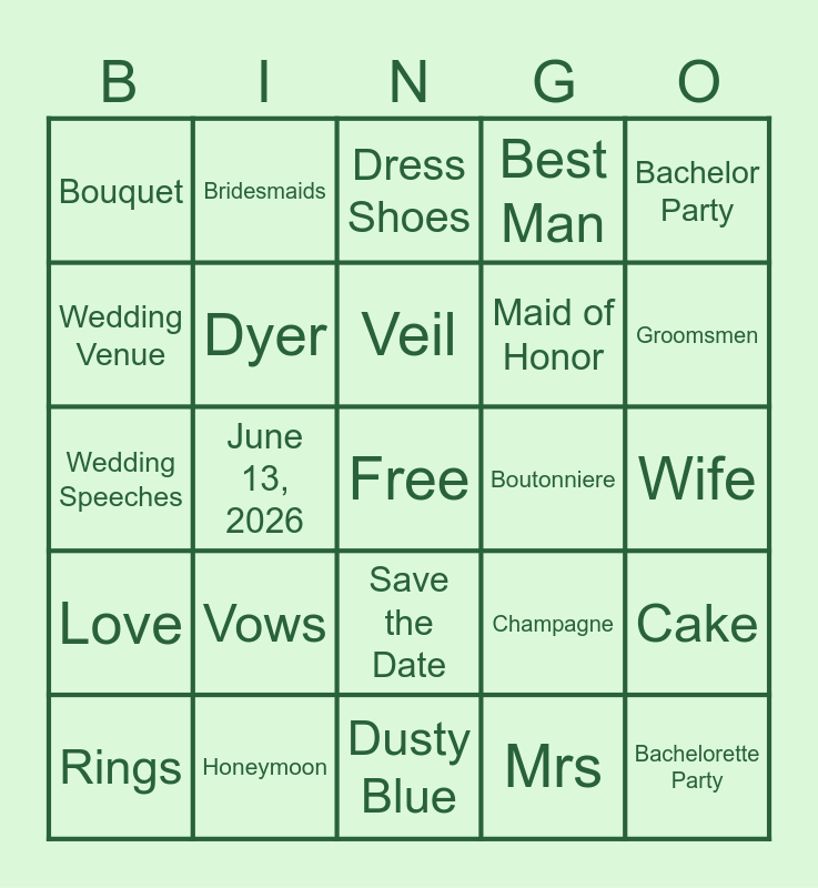 This bingo card has a free space and 29 words: Rings, Navy Blue, June 13, 2026, Bow Tie, Bouquet, Dress Shoes, Dyer, Vows, Boutonniere, Honeymoon, Wife, Bachelorette Party, Dusty Blue, Mrs, Groomsmen, Mr, Save the Date, Love, Bachelor Party, Wedding Speeches, Champagne, Husband, Maid of Honor, Wedding Venue, Best Man, Bridesmaids, Cake, Veil and Tuxedo.
