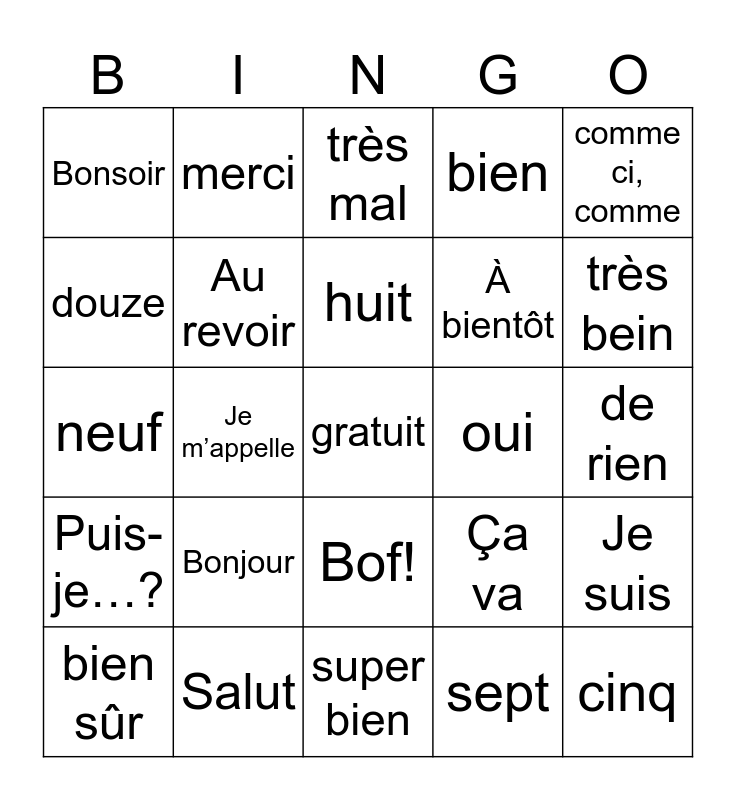 This bingo card has a free space and 24 words: Bonjour, Salut, huit, bien sûr, comme ci, comme, Bonsoir, douze, merci, oui, Bof!, À bientôt, neuf, Ça va, Je suis, Au revoir, sept, de rien, très mal, très bein, Je m’appelle, cinq, Puis-je…?, bien and super bien.