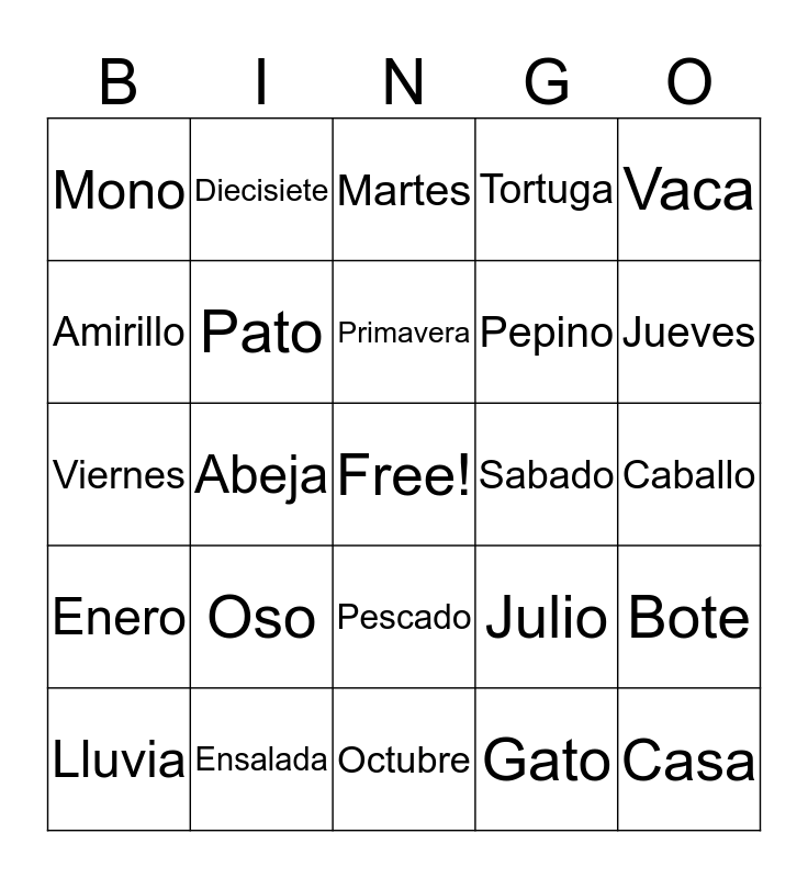 This bingo card has a free space and 24 words: Oso, Ensalada, Primavera, Lluvia, Vaca, Mono, Amirillo, Diecisiete, Sabado, Pescado, Pepino, Viernes, Julio, Bote, Pato, Gato, Caballo, Martes, Jueves, Abeja, Casa, Enero, Tortuga and Octubre.