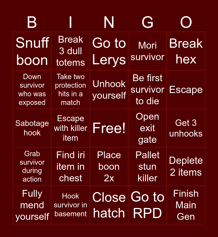 This bingo card has a free space and 45 words: Finish Shack Gen, Finish Main Gen, Fully heal survivor 3x, Fully mend yourself, Go to Dead Dawg Saloon, Go to RPD, Go to Lerys, Go to Ormond, Break hex, Hook survivor in basement, Mori survivor, Open exit gate, Place boon 2x, Find iri item in chest, Find complete key in chest, Close hatch, Be last survivor alive, Sabotage hook, Take successful dead-hard hit, Escape, Break 3 dull totems, Flashlight save, Complete invocation, Snuff boon, Use no perks, Get 3 unhooks, Head-on stun killer, Use no-mither, Pallet stun killer, Grab survivor during action, Use adept perks, Deplete 2 items, Stun the killer 2x, Successfully predict the killer, Get least amount of bp in match, Escape with killer item, Break 5 pallets, Throw 3 pallets in chase, Kill survivor during end game collapse, Unhook yourself, Down survivor who was exposed, Be first survivor to die, Mori survivor, Take two protection hits in a match and Play the game muted.