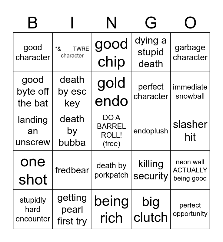 This bingo card has a free space and 24 words: stupidly hard encounter, fredbear, gold endo, big clutch, garbage character, good character, *&____TWRE character, good chip, endoplush, slasher hit, landing an unscrew, death by esc key, killing security, neon wall ACTUALLY being good, good byte off the bat, getting pearl first try, being rich, dying a stupid death, immediate snowball, one shot, death by bubba, death by porkpatch, perfect character and perfect opportunity.