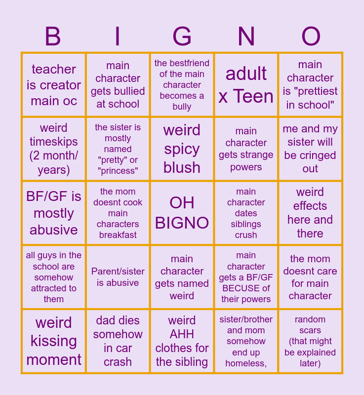 This bingo card has a free space and 24 words: Parent/sister is abusive, dad dies somehow in car crash, weird spicy blush, weird kissing moment, main character is "prettiest in school", teacher is creator main oc, weird timeskips (2 month/ years), main character gets bullied at school, main character dates siblings crush, main character gets named weird, main character gets strange powers, BF/GF is mostly abusive, main character gets a BF/GF BECUSE of their powers, the mom doesnt care for main character, the sister is mostly named "pretty" or "princess", sister/brother and mom somehow end up homeless,, weird effects here and there, the bestfriend of the main character becomes a bully, me and my sister will be cringed out, the mom doesnt cook main characters breakfast, random scars (that might be explained later), all guys in the school are somehow attracted to them, adult x Teen and weird AHH clothes for the sibling.