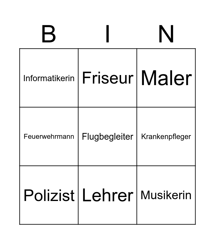 This bingo card has 19 words: Ärztin, Metzger, Maler, Bäcker, Frei!, Flugbegleiter, Mechaniker, Informatikerin, Friseur, Musikerin, Fotograf, Krankenpfleger, Polizist, Schauspieler, Pilotin, Politiker, Feuerwehrmann, Lehrer and Kellnerin.