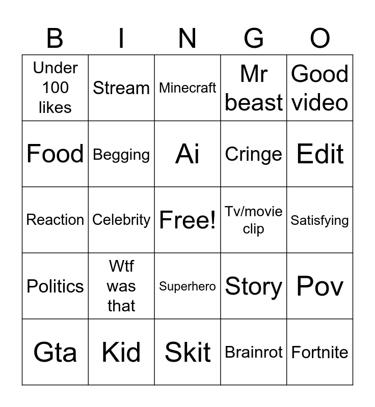 This bingo card has a free space and 24 words: Wtf was that, Kid, Ai, Gta, Good video, Under 100 likes, Food, Stream, Tv/movie clip, Superhero, Cringe, Reaction, Story, Pov, Begging, Brainrot, Satisfying, Minecraft, Edit, Celebrity, Fortnite, Politics, Mr beast and Skit.