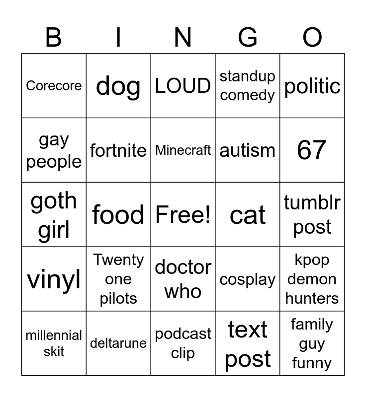 This bingo card has a free space and 24 words: Twenty one pilots, deltarune, Minecraft, millennial skit, politic, Corecore, gay people, dog, cat, doctor who, autism, goth girl, cosplay, kpop demon hunters, fortnite, text post, tumblr post, LOUD, 67, food, family guy funny, vinyl, standup comedy and podcast clip.