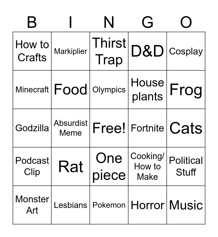 This bingo card has a free space and 24 words: Rat, Lesbians, Olympics, Monster Art, Cosplay, How to Crafts, Minecraft, Markiplier, Fortnite, One piece, House plants, Godzilla, Cooking/ How to Make, Political Stuff, Food, Horror, Cats, Thirst Trap, Frog, Absurdist Meme, Music, Podcast Clip, D&D and Pokemon.