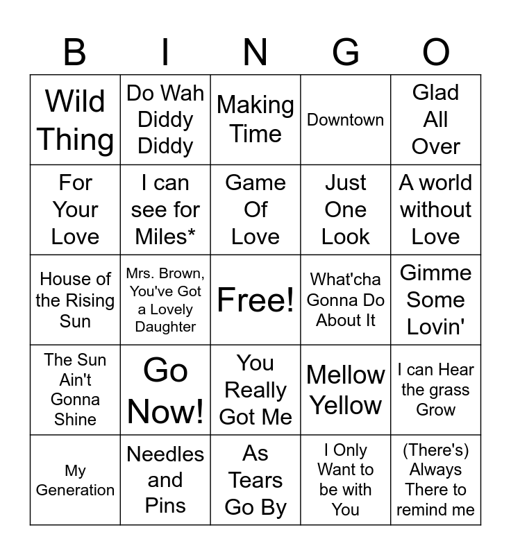 This bingo card has a free space and 44 words: Black is Black, (There's) Always There to remind me, (I Can't Get No) Satisfaction, My Generation, She's not there, I Only Want to be with You, Making Time, Help!, Glad All Over, Needles and Pins, Downtown, What'cha Gonna Do About It, You Really Got Me, Go Now!, Bus Stop, As Tears Go By, Heart Full Of Soul, House of the Rising Sun, It's Not Unusual, A world without Love, Do Wah Diddy Diddy, Friday On My Mind, Gloria, Wild Thing, Don't Let the Sun Catch You Crying, Gimme Some Lovin', Don't Bring Me Down, Till the End of the Day, Mellow Yellow, The Sun Ain't Gonna Shine, She Loves You, I can Hear the grass Grow, Hippy Hippy Shake, Summer Holiday, Mrs. Brown, You've Got a Lovely Daughter, Any Way You Want It, The Last Time, Tobacco Road, Game Of Love, For Your Love, Just One Look, Substitue, I can see for Miles* and My Love*.