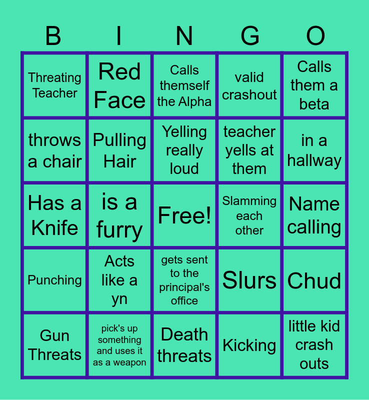 This bingo card has a free space and 24 words: Gun Threats, Acts like a yn, Yelling really loud, Kicking, Calls them a beta, Threating Teacher, Red Face, Calls themself the Alpha, Slamming each other, Name calling, Has a Knife, Pulling Hair, Slurs, Chud, throws a chair, pick's up something and uses it as a weapon, Death threats, valid crashout, in a hallway, Punching, is a furry, gets sent to the principal's office, teacher yells at them and little kid crash outs.