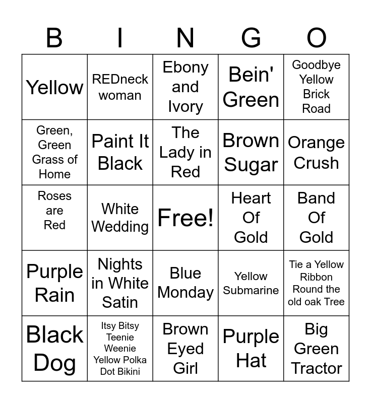 This bingo card has a free space and 39 words: Blue (Da Ba Dee), Purple Lamborghini, Red Lights, Paint It Black, Black Dog, Blue Monday, The Lady in Red, Little Red Corvette, Goodbye Yellow Brick Road, Purple Rain, White Wedding, Bein' Green, Big Green Tractor, Band Of Gold, Heart Of Gold, Nights in White Satin, Mellow Yellow, Yellow, Red Red Wine, Yellow Submarine, Green, Green Grass of Home, Brown Eyed Girl, Brown Sugar, Orange Crush, The Orange and the Green, Back in Black, Black Widow, Men in Black, Black Velvet, REDneck woman, True Blue, Counting Blue Cars, Ebony and Ivory, Itsy Bitsy Teenie Weenie Yellow Polka Dot Bikini, Purple Hat, Out of the blue, Tie a Yellow Ribbon Round the old oak Tree, Roses are Red and Lavender Blue (Dilly, Dilly)“ So Dear to My Heart.