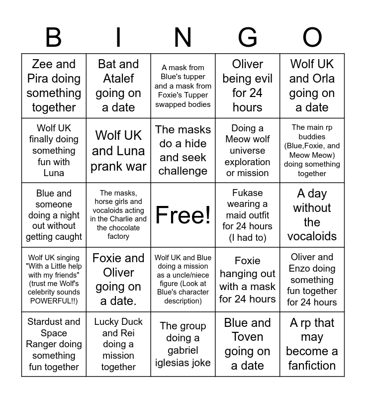 This bingo card has a free space and 24 words: Foxie and Oliver going on a date., Lucky Duck and Rei doing a mission together, The masks do a hide and seek challenge, Stardust and Space Ranger doing something fun together, Wolf UK and Orla going on a date, Zee and Pira doing something together, Wolf UK finally doing something fun with Luna, Bat and Atalef going on a date, Fukase wearing a maid outfit for 24 hours (I had to), Wolf UK and Blue doing a mission as a uncle/niece figure (Look at Blue's character description), Doing a Meow wolf universe exploration or mission, Blue and someone doing a night out without getting caught, Foxie hanging out with a mask for 24 hours, Oliver and Enzo doing something fun together for 24 hours, Wolf UK and Luna prank war, Blue and Toven going on a date, A day without the vocaloids, A mask from Blue's tupper and a mask from Foxie's Tupper swapped bodies, The main rp buddies (Blue,Foxie, and Meow Meow) doing something together, The masks, horse girls and vocaloids acting in the Charlie and the chocolate factory, A rp that may become a fanfiction, Wolf UK singing "With a Little help with my friends" (trust me Wolf's celebrity sounds POWERFUL!!), Oliver being evil for 24 hours and The group doing a gabriel iglesias joke.