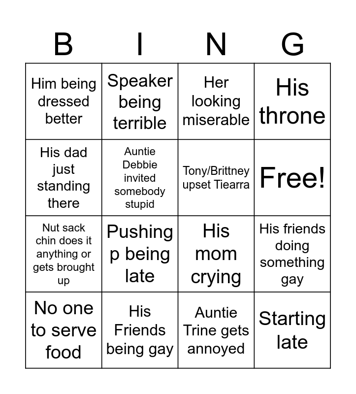 This bingo card has 18 words: Pushing p being late, Starting late, Her looking miserable, Him being dressed better, His mom crying, His throne, No one to serve food, Speaker being terrible, Free!, Nut sack chin does it anything or gets brought up, Auntie Trine gets annoyed, His dad just standing there, His friends doing something gay, Auntie Debbie invited somebody stupid, Tony/Brittney upset Tiearra, It being a girl, His Friends being gay and Him being in happier than her.