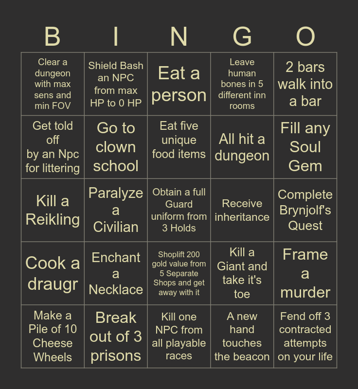 This bingo card has 59 words: Steal candy from Nazeem (Da Baby), Break out of 3 prisons, Sell Skooma, Cook a draugr, A new hand touches the beacon, Disable an NPC, Go to clown school, Die to fall damage, All hit a dungeon, Giant space program, Leave human bones in 5 different inn rooms, Become a clone of an important NPC, Get told off by an Npc for littering, Jump off the throat of the world and live, Contract all 9 contractible diseases, Clear a dungeon with max sens and min FOV, Obtain a full Guard uniform from 3 Holds, 2 bars walk into a bar, Bankrupt a Merchant, Eat five unique food items, Receive inheritance, Eat a person, Make a Pile of 10 Cheese Wheels, Frame a murder, 10,000 Total Bounty, Obtain a Follower, Punch a Jarl, Reach Level 10, Fill any Soul Gem, Interrupt Rogvir's Execution & Escape, Get Married, Steal A Dibella Statue, Killcam a Deer w/ an elemental arrow, Find 3 standing stones, Shield Bash an NPC from max HP to 0 HP, Break out of Jail, Pickpocket an Enchanted Ring, Paralyze a Civilian, Kill a Frost Troll, Kill a Reikling, Spend EXACTLY 1000 gold in one shopping trip, Enchant a Necklace, Complete Brynjolf's Quest, Enter a Player Home, Kill a Daedra, Kill an enemy using a trap, Loot a Unique Item, Pray to Every Divine, Shoplift 200 gold value from 5 Separate Shops and get away with it, Kill one NPC from all playable races, Speak to all 9 Jarls, Donate to all 11 Beggars, Free a Prisoner from Capture, Sell a farmer all their own crops, Meet a Ghost, Kill a Giant and take it's toe, Perform a Kill Cam with 3 different weapon types, Fend off 3 contracted attempts on your life and Learn one min. Apprentice Lvl Spell from all 5 schools.