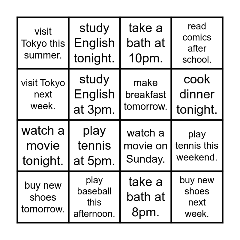 This bingo card has 24 words: study math at 4pm., study math at 6pm., cook dinner tonight., cook dinner on Saturday., visit Tokyo next week., visit Tokyo this summer., study English at 3pm., study English tonight., play baseball this afternoon., play baseball after school., watch a movie tonight., watch a movie on Sunday., see my grandpa tomorrow., see my grandpa this weekend., make breakfast tomorrow., make breakfast on Saturday., take a bath at 8pm., take a bath at 10pm., play tennis at 5pm., play tennis this weekend., buy new shoes tomorrow., buy new shoes next week., read comics after school. and read comics tonight..