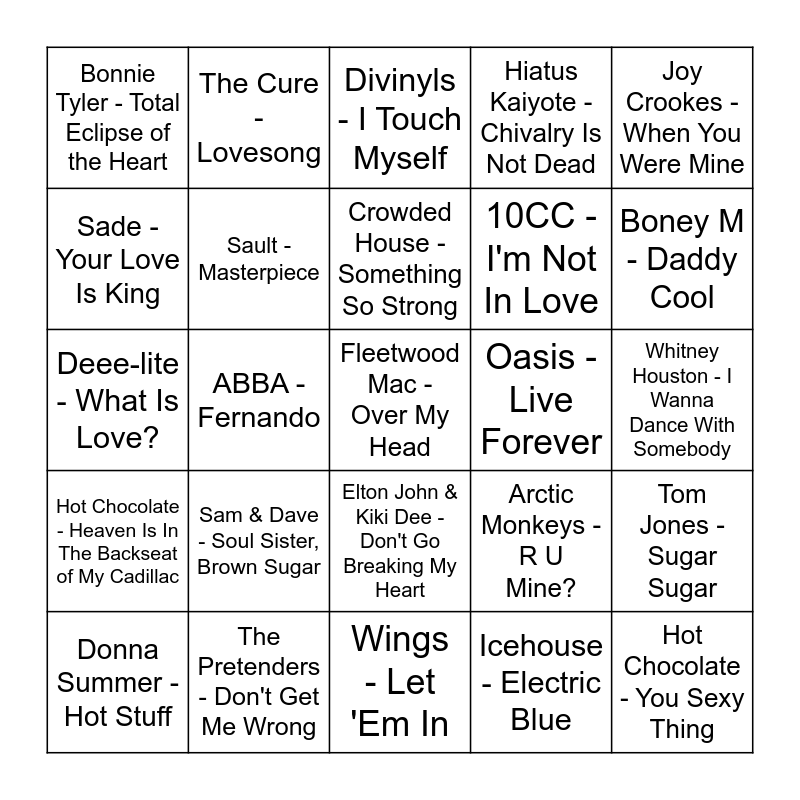 This bingo card has 46 words: Fleetwood Mac - Say You Love Me, Fleetwood Mac - Over My Head, Wings - Silly Love Songs, Wings - Let 'Em In, Sam & Dave - Soul Sister, Brown Sugar, Silk Sonic - Leave the Door Open, The Cure - Lovesong, Amy Winehouse - He Can Only Hold Her, Sade - Your Love Is King, Sade - Hang On To Your Love, Sault - Masterpiece, Hiatus Kaiyote - Chivalry Is Not Dead, Tom Jones - Sugar Sugar, Arctic Monkeys - R U Mine?, Bread - Make It With You, The Rolling Stones - Beast of Burden, Crowded House - Something So Strong, Oasis - Live Forever, Donovan - I Love My Shirt, Joy Crookes - When You Were Mine, ABBA - Fernando, Icehouse - Electric Blue, Bonnie Tyler - Total Eclipse of the Heart, 10CC - I'm Not In Love, Black Box - Ride On Time, Boney M - Daddy Cool, Donna Summer - Hot Stuff, Michael Jackson - Don't Stop Til You Get Enough, Elton John & Kiki Dee - Don't Go Breaking My Heart, Hot Chocolate - Heaven Is In The Backseat of My Cadillac, Sinitta - Right Back Where We Started From, KC & The Sunshine Band - Give It Up, Kim Wilde - You Keep Me Hangin' On, E.M.F. - Unbelievable, Divinyls - Science Fiction, The Pretenders - Don't Get Me Wrong, Whitney Houston - I Wanna Dance With Somebody, INXS - Need You Tonight, Stevie Wright - Evie, Jimmy Barnes - Ain't No Mountain High Enough, Hot Chocolate - You Sexy Thing, Divinyls - I Touch Myself, Deee-lite - What Is Love?, Sylvester - You Make Me Feel, Chic - Le Freak and Christie Allen - Goose Bumps.