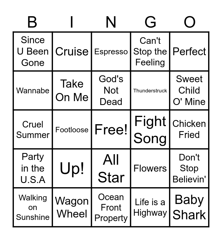 This bingo card has a free space and 46 words: Golden, Baby Shark, Roar, Ocean Front Property, Up!, My Lighthouse, Cruise, Raining Tacos, Wannabe, Forever and Ever, Amen, Take On Me, Can't Stop the Feeling, Don't Stop Believin', Flowers, Levitating, Thunder, God's Not Dead, Fight Song, Livin' on a Prayer, Perfect, Footloose, Life is a Highway, Since U Been Gone, Thunderstruck, Eye of the Tiger, Sweet Child O' Mine, Walking on Sunshine, I Want It That Way, All Star, Party in the U.S.A, Shake it Off, Happy, As It Was, 9 to 5, Man! I Feel Like a Woman!, Wagon Wheel, Chicken Fried, We Will Rock You, Grave Robber, Who You Say I Am, Praise You Anywhere, Espresso, Cruel Summer, Shut Up and Dance, The Fox and Steve's Lava Chicken.