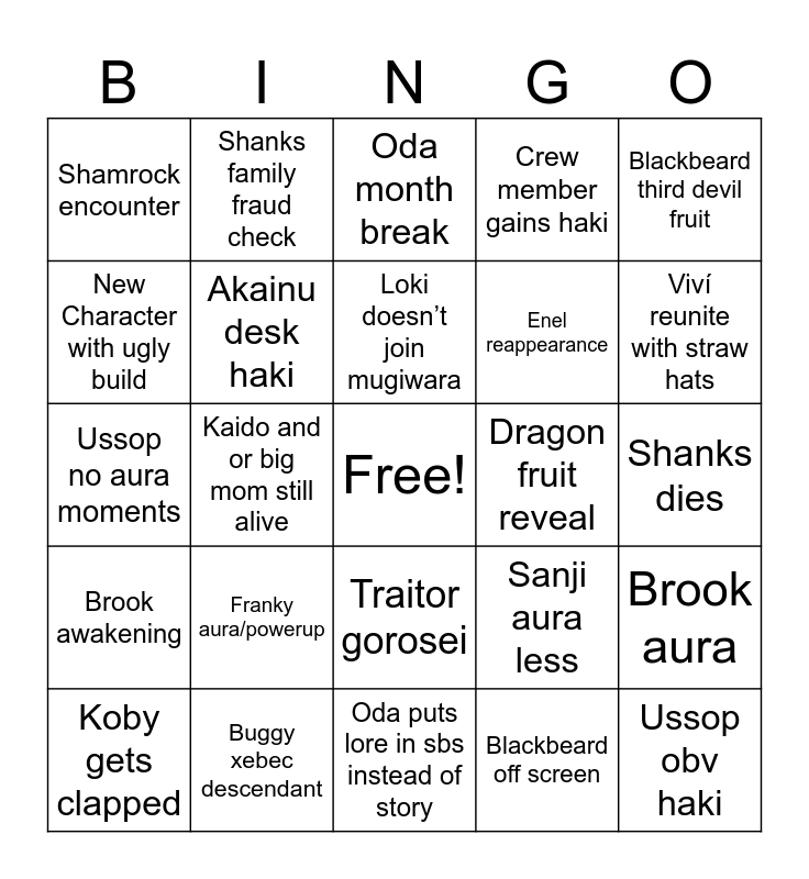 This bingo card has a free space and 24 words: Franky aura/powerup, Buggy xebec descendant, Loki doesn’t join mugiwara, Koby gets clapped, Blackbeard third devil fruit, Shamrock encounter, New Character with ugly build, Shanks family fraud check, Dragon fruit reveal, Traitor gorosei, Enel reappearance, Ussop no aura moments, Sanji aura less, Brook aura, Akainu desk haki, Blackbeard off screen, Shanks dies, Oda month break, Viví reunite with straw hats, Kaido and or big mom still alive, Ussop obv haki, Brook awakening, Crew member gains haki and Oda puts lore in sbs instead of story.