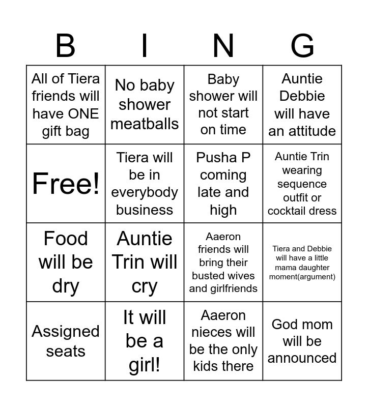 This bingo card has 16 words: It will be a girl!, Tiera and Debbie will have a little mama daughter moment(argument), Baby shower will not start on time, All of Tiera friends will have ONE gift bag, Food will be dry, No baby shower meatballs, Aaeron friends will bring their busted wives and girlfriends, Aaeron nieces will be the only kids there, Free!, Tiera will be in everybody business, Assigned seats, Auntie Debbie will have an attitude, Auntie Trin will cry, Auntie Trin wearing sequence outfit or cocktail dress, Pusha P coming late and high and God mom will be announced.