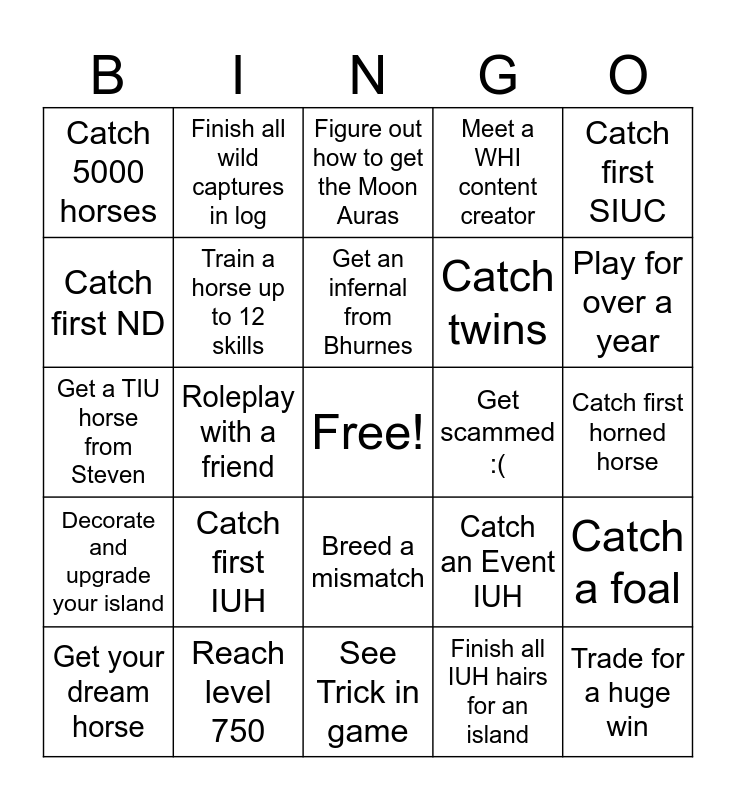 This bingo card has a free space and 24 words: Catch first IUH, Reach level 750, Get an infernal from Bhurnes, Get your dream horse, Catch first SIUC, Catch 5000 horses, Catch first ND, Finish all wild captures in log, Get scammed :(, Breed a mismatch, Catch twins, Get a TIU horse from Steven, Catch an Event IUH, Catch a foal, Train a horse up to 12 skills, Finish all IUH hairs for an island, Catch first horned horse, Figure out how to get the Moon Auras, Play for over a year, Roleplay with a friend, Trade for a huge win, Decorate and upgrade your island, Meet a WHI content creator and See Trick in game.