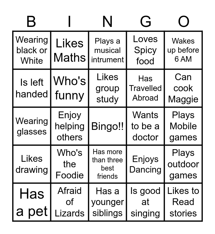 This bingo card has a free space and 24 words: Has a pet, Who's the Foodie, Likes group study, Is good at singing, Wakes up before 6 AM, Wearing black or White, Likes Maths, Plays a musical intrument, Wants to be a doctor, Plays Mobile games, Wearing glasses, Who's funny, Enjoys Dancing, Plays outdoor games, Is left handed, Afraid of Lizards, Has a younger siblings, Loves Spicy food, Can cook Maggie, Likes drawing, Enjoy helping others, Has more than three best friends, Has Travelled Abroad and Likes to Read stories.