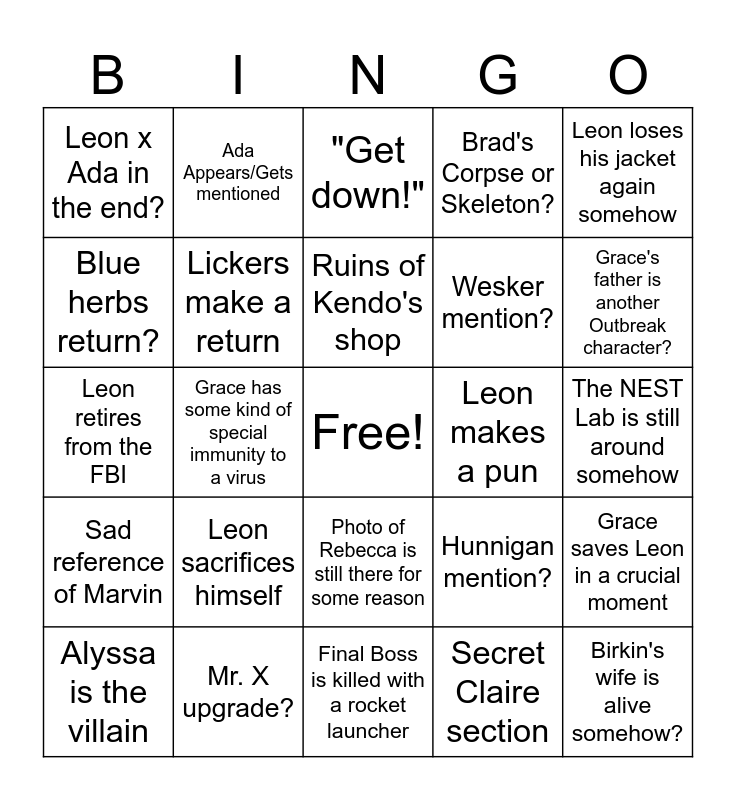 This bingo card has a free space and 24 words: Alyssa is the villain, Leon sacrifices himself, Ruins of Kendo's shop, Secret Claire section, Leon loses his jacket again somehow, Leon x Ada in the end?, Ada Appears/Gets mentioned, "Get down!", Leon makes a pun, The NEST Lab is still around somehow, Leon retires from the FBI, Lickers make a return, Hunnigan mention?, Grace saves Leon in a crucial moment, Blue herbs return?, Mr. X upgrade?, Final Boss is killed with a rocket launcher, Brad's Corpse or Skeleton?, Grace's father is another Outbreak character?, Sad reference of Marvin, Grace has some kind of special immunity to a virus, Photo of Rebecca is still there for some reason, Wesker mention? and Birkin's wife is alive somehow?.