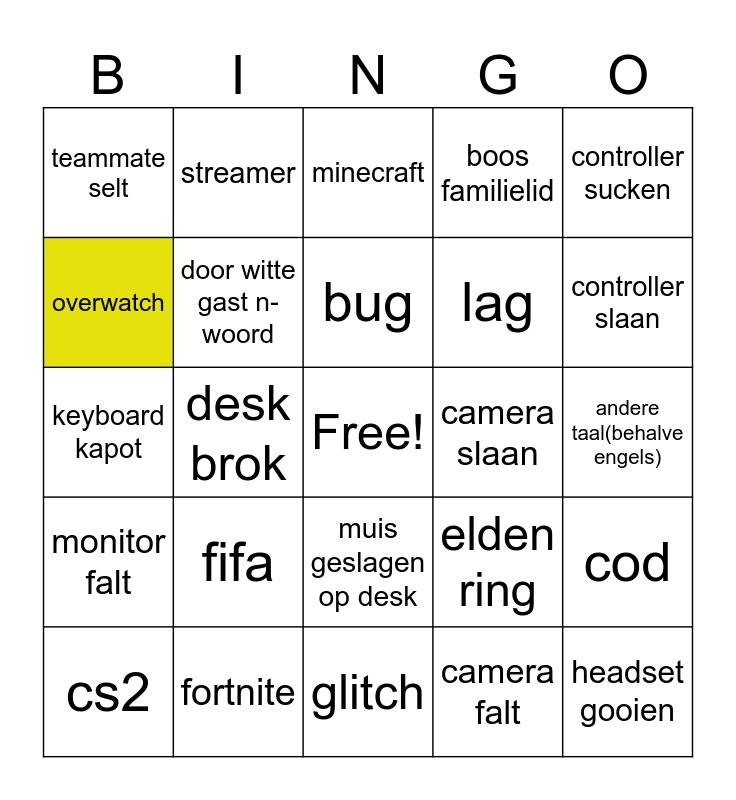 This bingo card has a free space and 24 words: fifa, fortnite, bug, cs2, controller sucken, teammate selt, overwatch, streamer, camera slaan, muis geslagen op desk, lag, keyboard kapot, elden ring, cod, door witte gast n-woord, camera falt, andere taal(behalve engels), minecraft, controller slaan, desk brok, headset gooien, monitor falt, boos familielid and glitch.